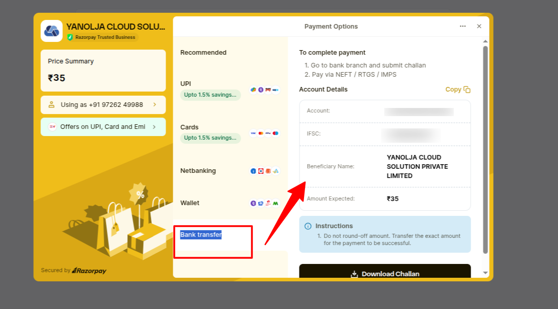 Please follow the below steps to make payment via bank transfer or challan from the invoice: