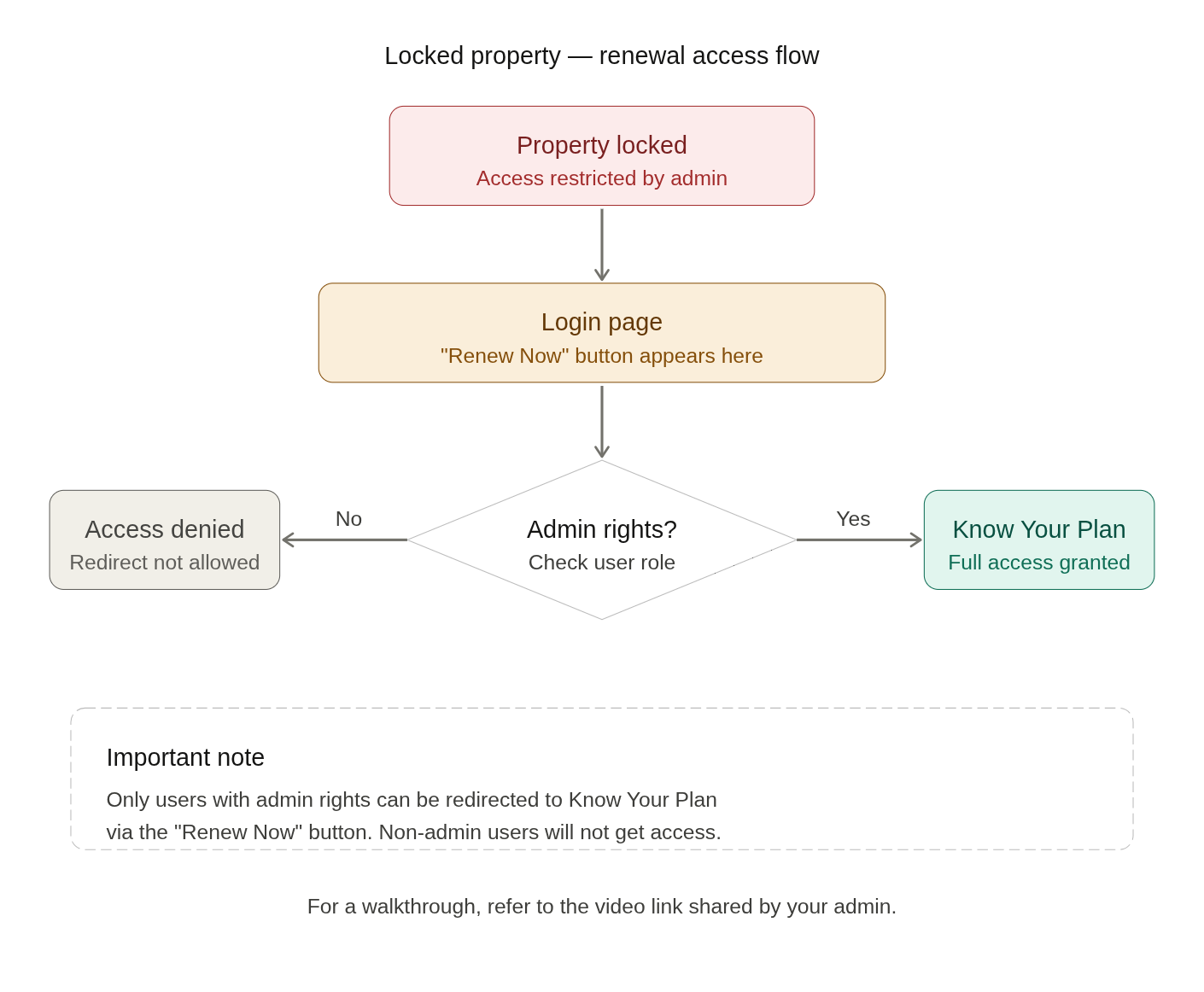 Key point to remember: Admin access is a prerequisite — without it, the renewal redirect will not work.