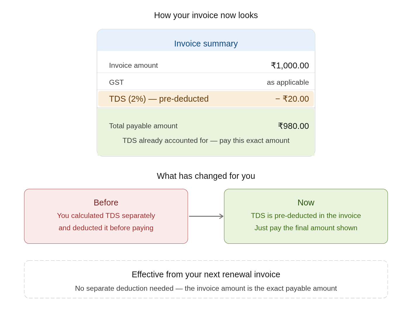 How it works — Starting from your next renewal, your invoice will automatically show the TDS amount already deducted, just like GST appears on your invoice today. For example, on a ₹1,000 invoice with 2% TDS, you will see ₹20 listed under TDS and your final payable amount will simply be ₹980.